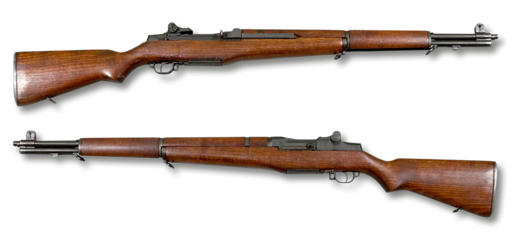 - M1 Garand America’s answer to the bolt-action world. Eight rounds of .30-06 that ping out when empty. General Patton called it the greatest battle implement ever devised. The en-bloc clip leaving the rifle with that metallic cough is one of warfare’s most satisfying sounds.