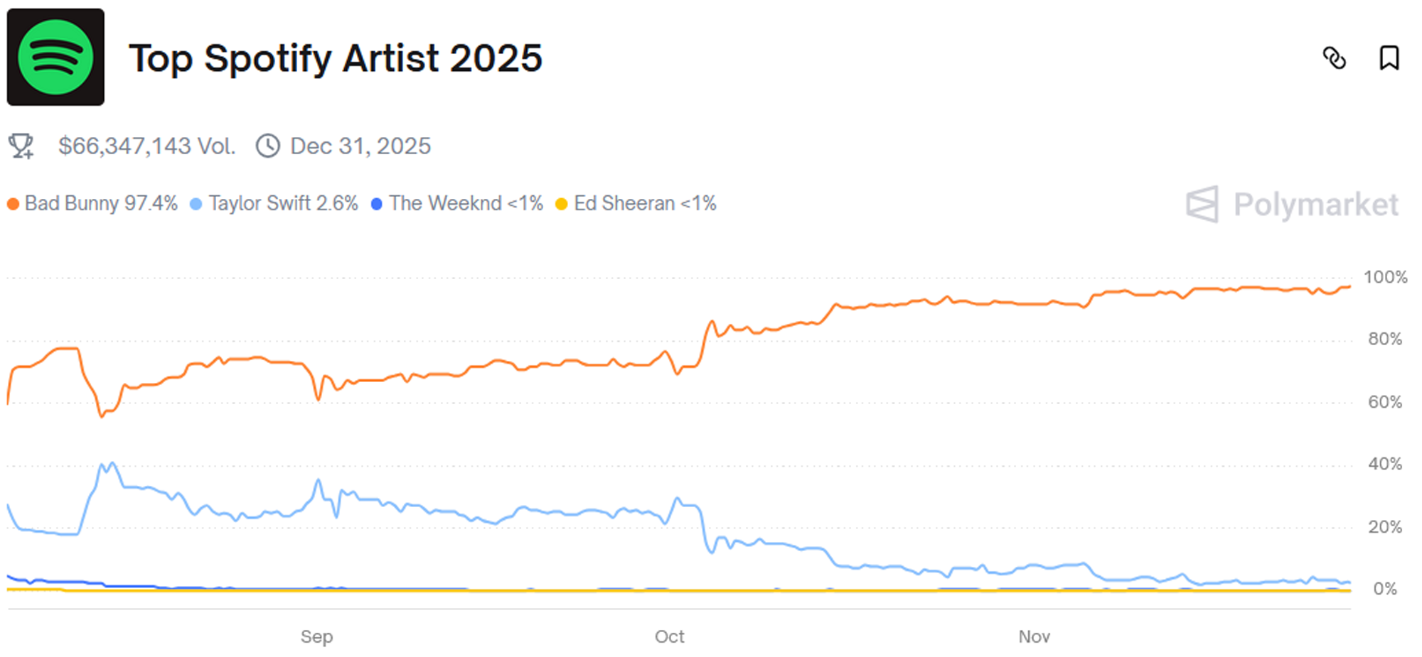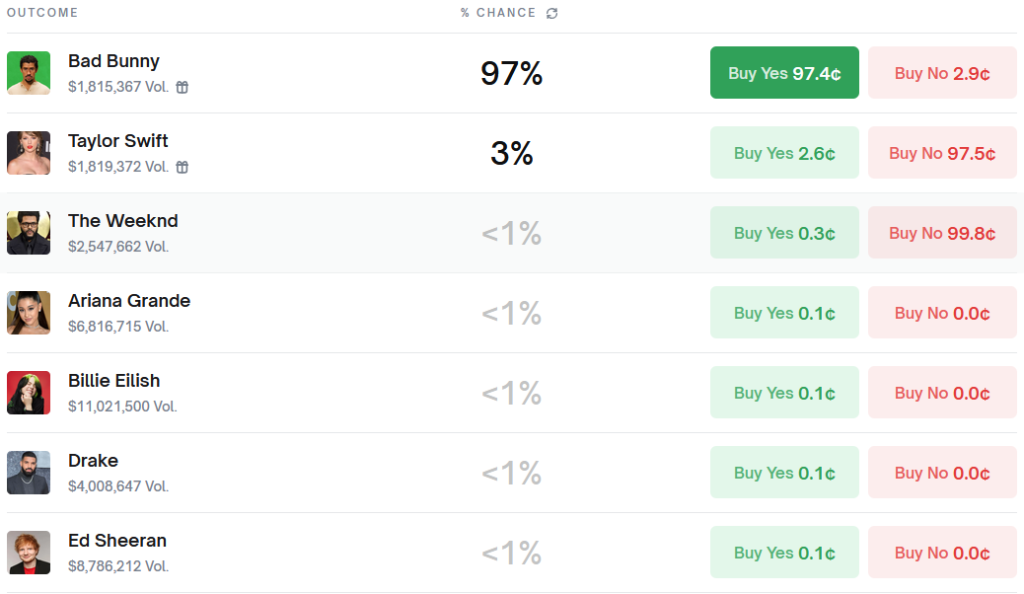 Polymarket rarely gets culture wrong when real money rides on the outcome. Right now, traders give Bad Bunny a 97 per cent shot at becoming Spotify’s most-streamed artist of 2025. Taylor Swift sits at a distant 3 per cent. The contract has already seen more than $1.8 million in volume, and “Yes” shares on Bad Bunny trade at 97 cents. That means a dollar bet returns just three cents profit if he wins. The market is basically shouting that it’s over.