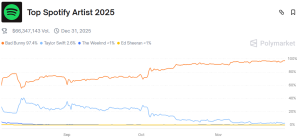 Polymarket rarely gets culture wrong when real money rides on the outcome. Right now, traders give Bad Bunny a 97 per cent shot at becoming Spotify’s most-streamed artist of 2025. Taylor Swift sits at a distant 3 per cent. The contract has already seen more than $1.8 million in volume, and “Yes” shares on Bad […]